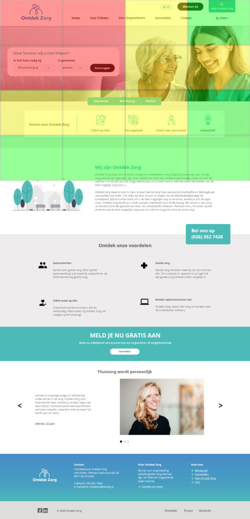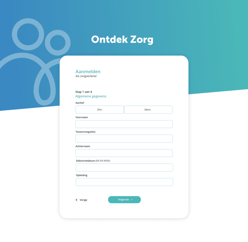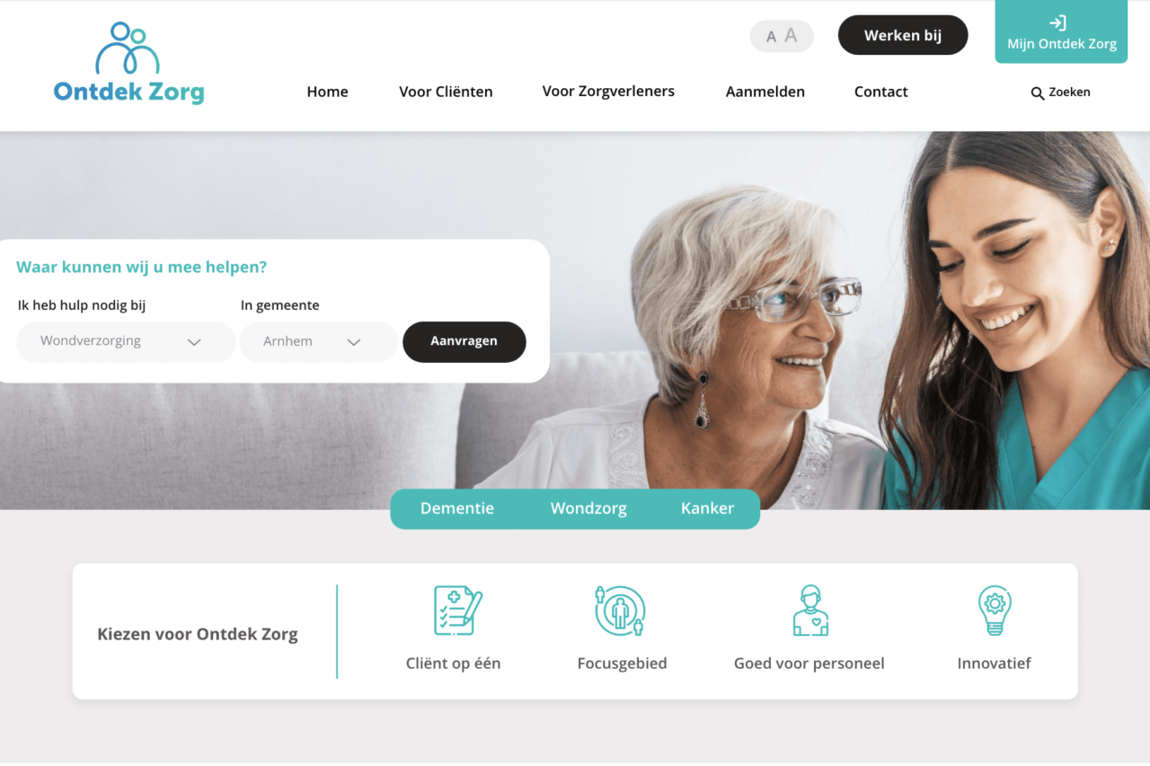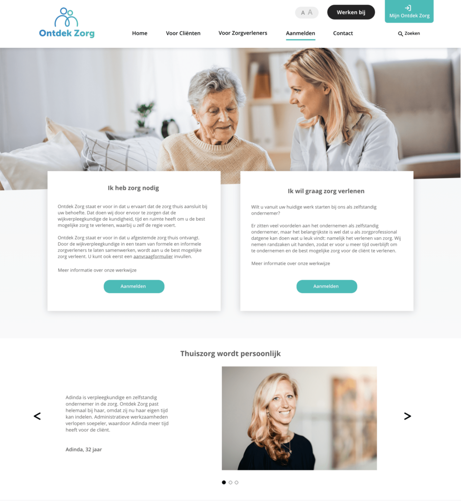 Branding & UX design - Ontdek Zorg Een nieuwe zorginstelling opzetten met een andere kijk op zorg. Dat was de ambitie van Ontdek Zorg. Transparant, eerlijk en mensgericht. Voor mijn afstudeerproject kreeg ik de opdracht om deze positionering te vertalen naar een merk dat vertrouwen wekt vanaf het eerste contact.Ik ontwikkelde de volledige branding: van visuele identiteit tot merkverhaal. Om tot gefundeerde keuzes te komen, deed ik uitgebreid onderzoek naar Gestalt-principes, semiotiek en liet ik verschillende concepten testen door de doelgroep. Op basis daarvan koos ik voor een palet van frisse blauw- en groentinten die rust, helderheid en toegankelijkheid uitstralen. Het logo toont twee personen die dicht bij elkaar staan. Een bewuste keuze die nabijheid, gelijkwaardigheid en persoonlijke aandacht verbeeldt. User Experience design Bij de start van een nieuwe zorgorganisatie is de website vaak het eerste echte contactmoment. Daarom lag mijn focus niet alleen op uitstraling, maar vooral op gebruiksgemak. De site moest zowel zorgvragers als zorgverleners ondersteunen, met ieder hun eigen informatiebehoefte. Ontzorgen Ik ontwierp een prototype waarin de bezoeker direct wordt geholpen bij de kernvraag: waarbij heb je ondersteuning nodig? In plaats van lange menu’s en algemene informatie, krijgt de gebruiker meteen richting. Dit voorkomt dat iemand in een kwetsbaar moment eerst een hele website moet doorzoeken voordat hij of zij geholpen wordt. De aanmeldpagina is ingericht op twee doelgroepen. Zorgverleners en zorgbehoevenden worden hier in twee duidelijke blokken aangesproken, met elk hun eigen taal en route. Vanuit deze pagina worden bezoekers doorgeleid naar een losse aanmeldomgeving. Zorgvragers en zorgverleners worden afzonderlijk aangesproken en doorgeleid naar een persoonlijk portaal. In dit portaal kunnen zij hun profiel beheren en relevante documenten inzien. De hele flow is zo ingericht dat stappen logisch voelen en nooit aanvoelen als een extra drempel.Dit project liet mij zien hoe merk, ontwerp en gebruiksgemak samenkomen op het moment dat iemand echt geholpen wil worden. Precies daar maak ik als maker het verschil. Share this: