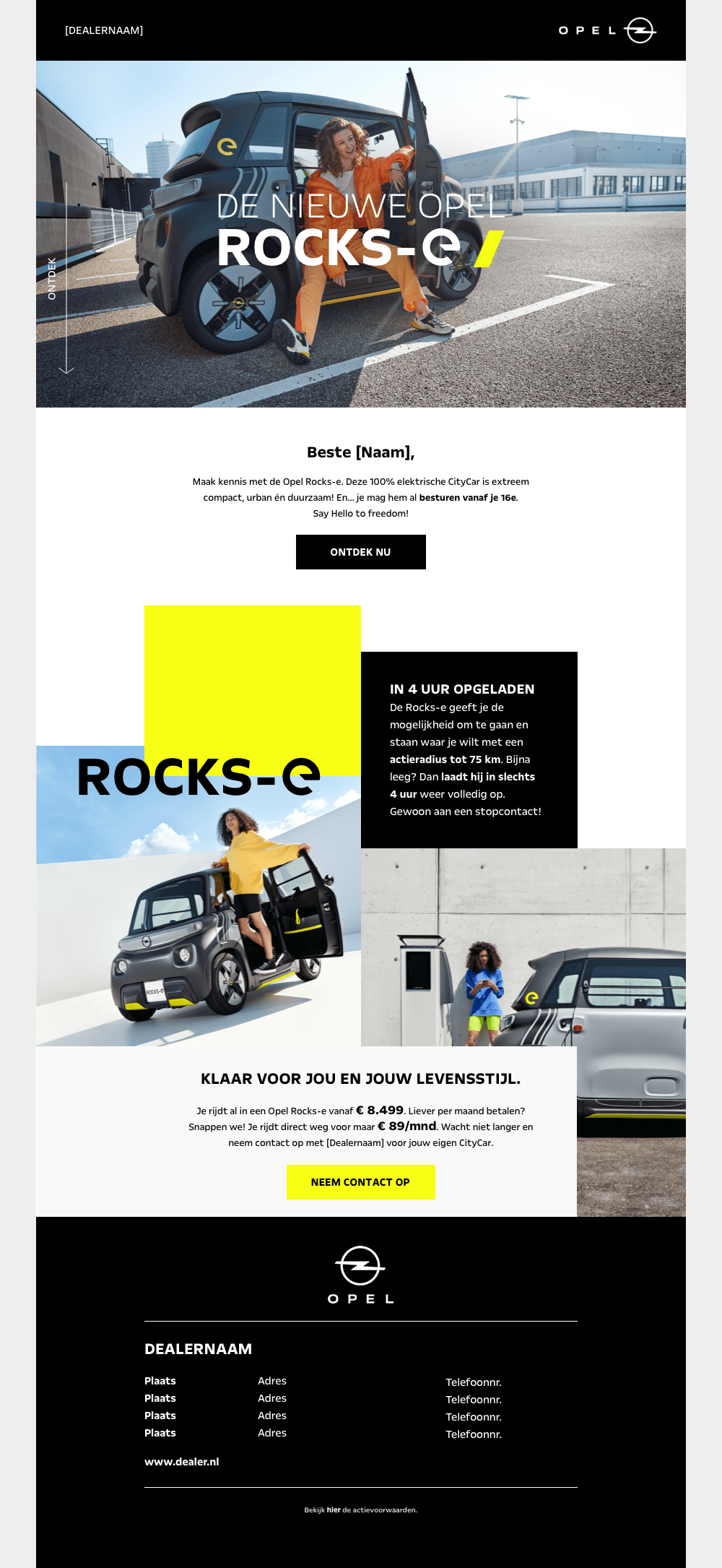 Opel Rocks-e & Astra: Bold design voor de nieuwe generatie. Urban mobility, jong en duurzaam. Opel stoffig? Think again. Voor de nieuwste modellen mocht ik de visuele koers varen om een jonge, duurzame doelgroep te bereiken. Urban mobility, maar dan met een flinke dosis energie.Voor de Opel Rocks-e richtte ik mij op Gen Z. Een volledig elektrische citycar waar je al vanaf je zestiende in mag rijden. De vormtaal is snel, uitgesproken en ritmisch. Denk aan tempo, typografie en beeldopbouw die aansluiten op hoe deze doelgroep consumeert.De Hybrid Opel Astra vroeg om een ander accent. Hier stond de jong-volwassen doelgroep centraal. Nog steeds duurzaam, maar met meer rust, ruimte en volwassenheid in beeld. Dezelfde merkwaarden, vertaald naar een andere levensfase. Van ontwerp naar experience Naast de video’s heb ik de campagne voor beide modellen doorgetrokken naar de inbox. In de e-mail marketing heb ik gekozen voor een ‘less is more’ approach.Geen lappen tekst, maar een strak design waar de visuals het werk doen. Helemaal in de branding van Opel: Bold typografie, krachtige CTA’s en een lay-out die direct de aandacht grijpt. Related projects Employee Advocacy programma Branding Podcast Voorblijvers: van aflevering naar scroll-stopper Branding Opel Rocks-e & Astra: Bold design voor de nieuwe generatie Branding